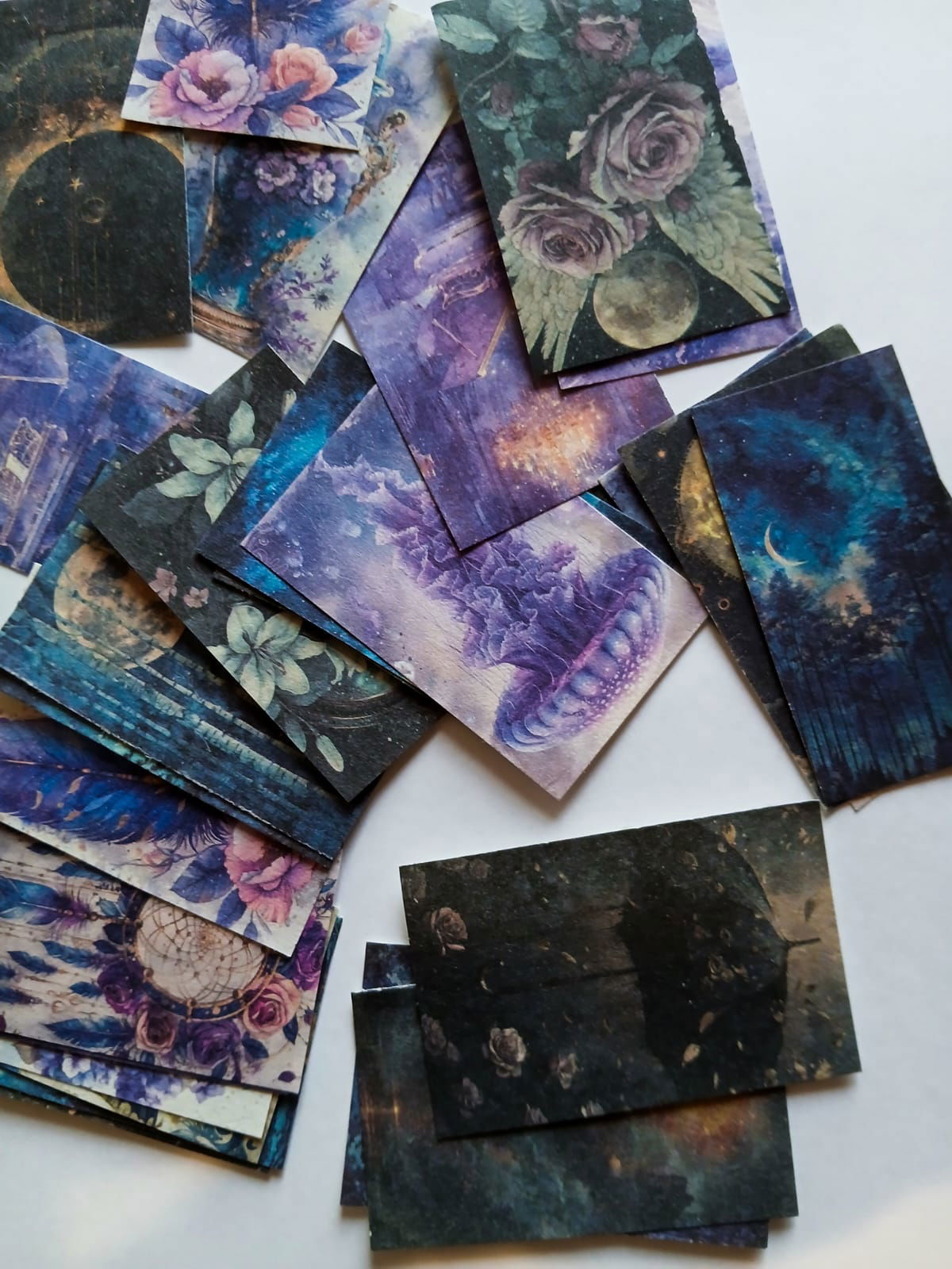 Incluye pequeños rectángulos de papel de 6 cm x 4 cm con ilustraciones de estilo mágico y celestial: flores, lunas, cielos estrellados, galaxias, nubes, atrapasueños, paraguas y detalles en tonos violetas, azules y verde oscuro.