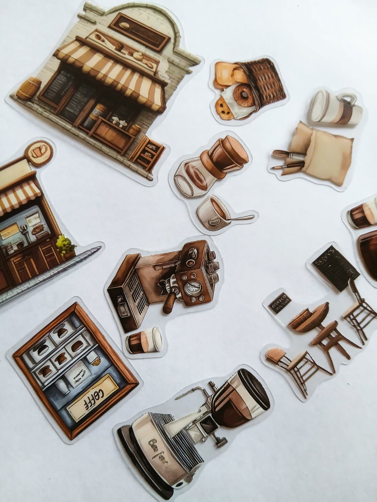 Set de stickers temática café, ideales para quienes aman el olor a espresso y la vibra de cafetería. Encontrás tazas, vasos tipo take away, granos de café, cafeteras y frases cute relacionadas al coffee time.