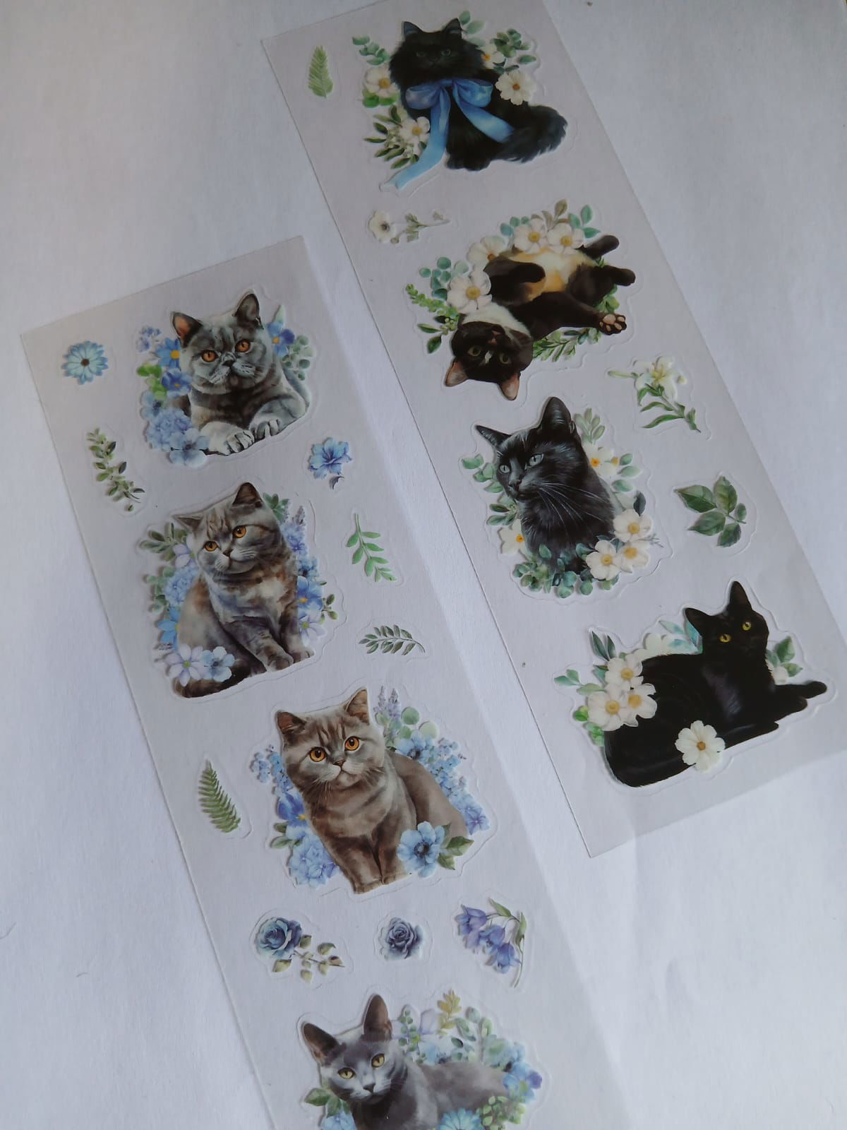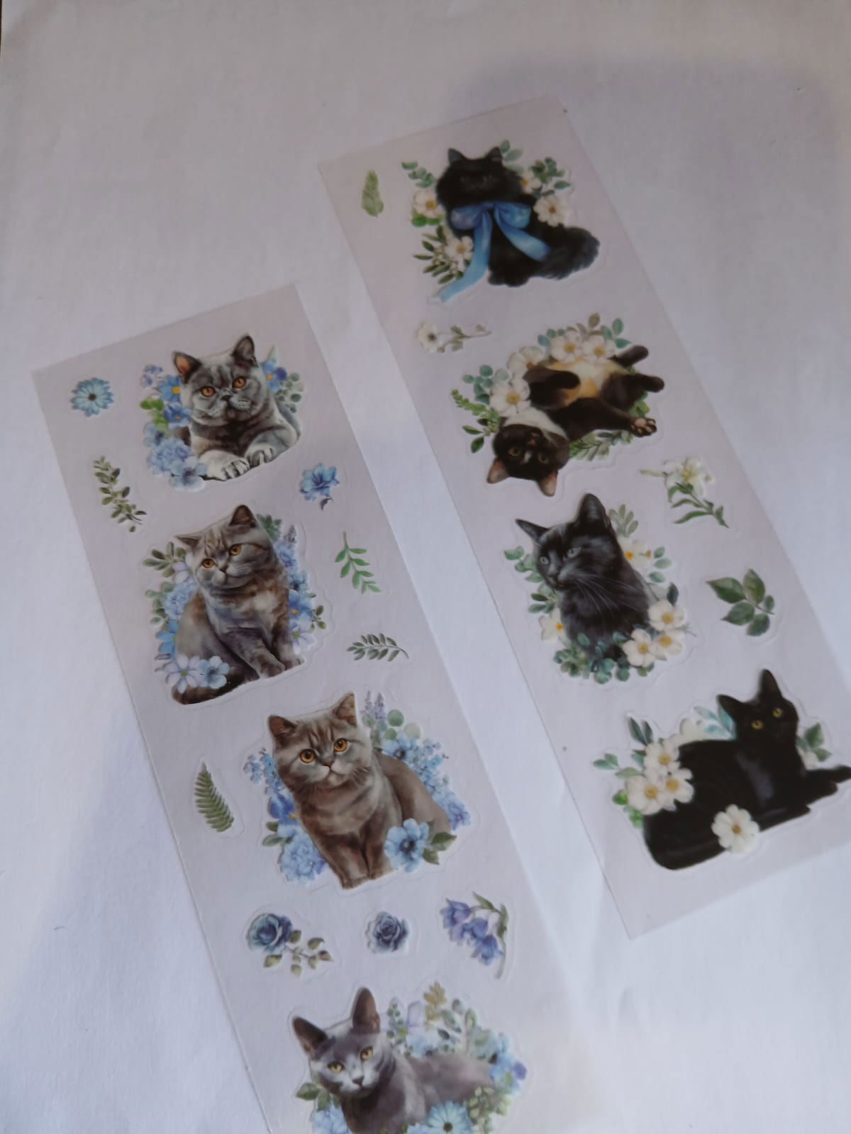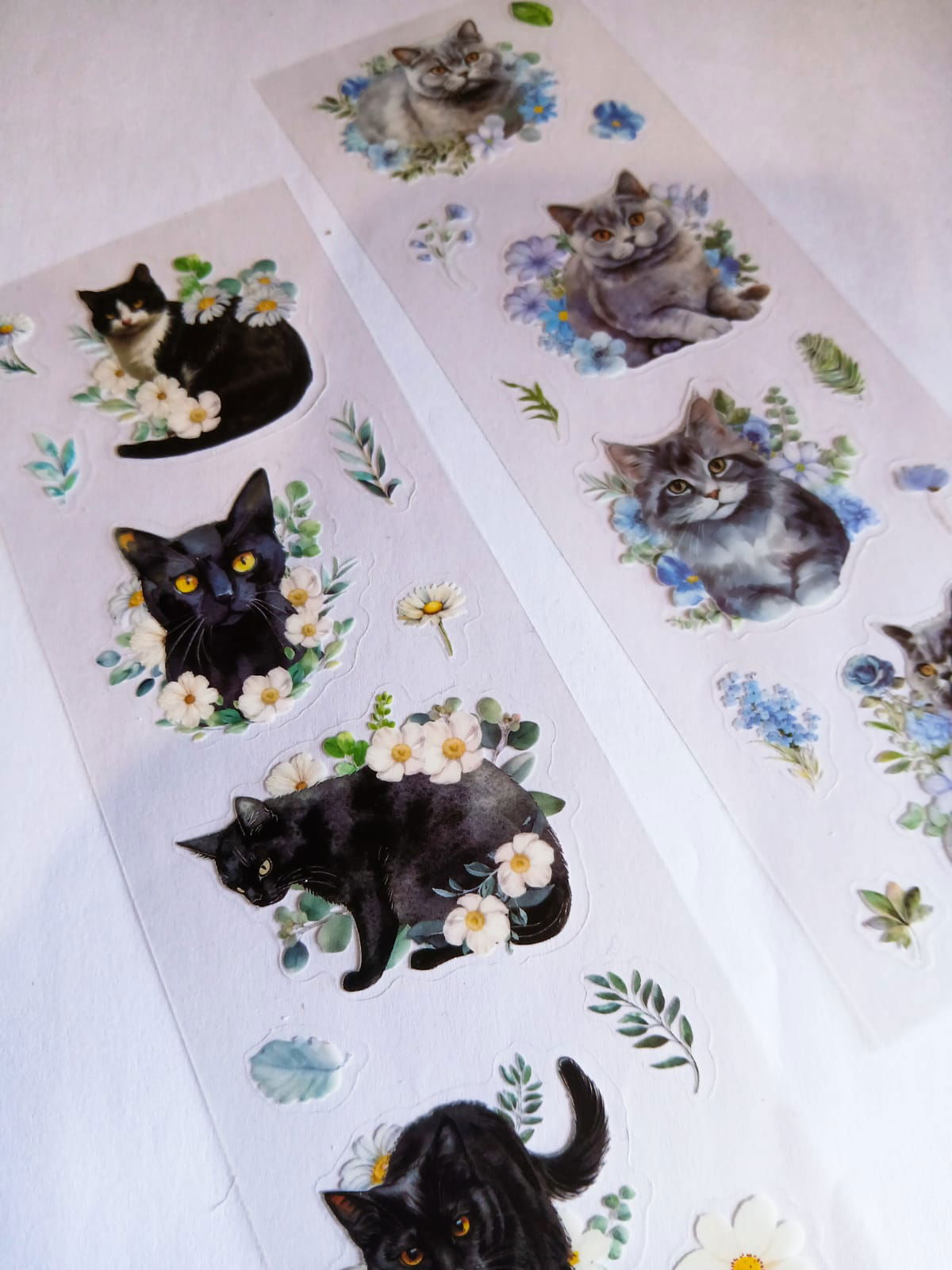 Stickers gatitos florales 🐱🌸 Plancha de stickers con gatitos realistas rodeados de flores y hojitas en tonos suaves. Ideales para decorar journals, agendas y cartas con un estilo tierno y delicado.