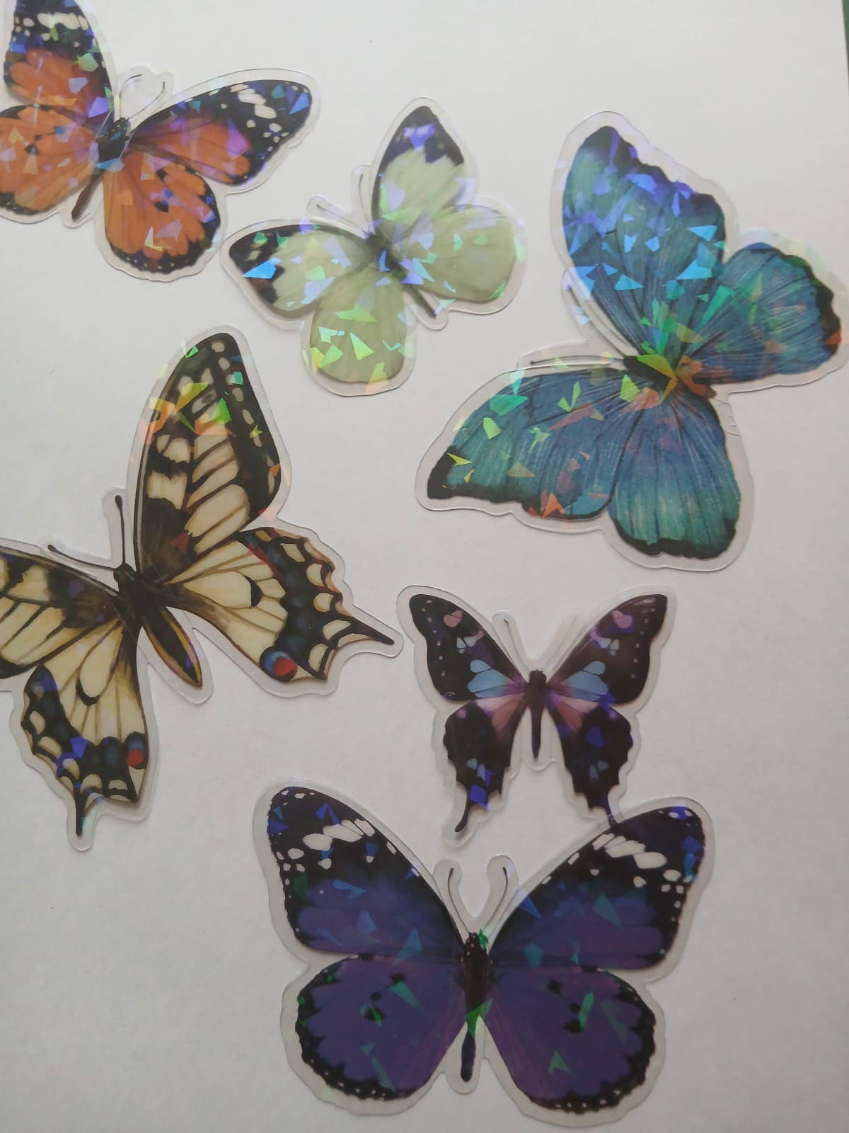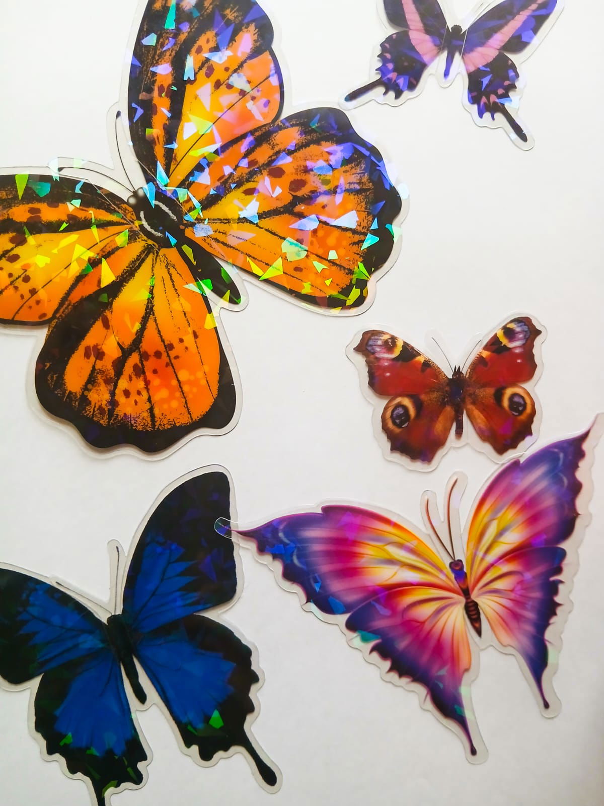 🦋✨Pack de 5 mariposas decorativas con diseños a todo color y efecto brillante, ideales para sumar un toque mágico a tus proyectos. No son adhesivas: se pueden pegar con cinta, pegamento o washi tape.
