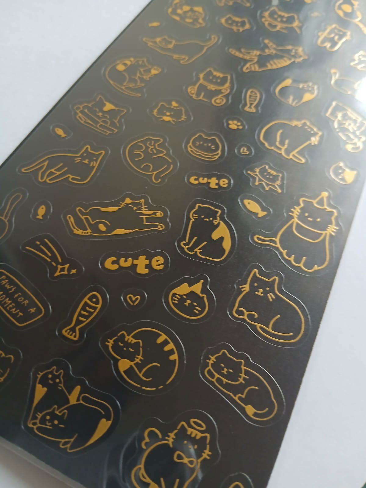 Una plancha de stickers PET con ilustraciones de gatitos en dorado metalizado. Son finitos, resistentes y con efecto brillante, ideales para darle un toque elegante y cute a agendas, cuadernos, celu y journaling.