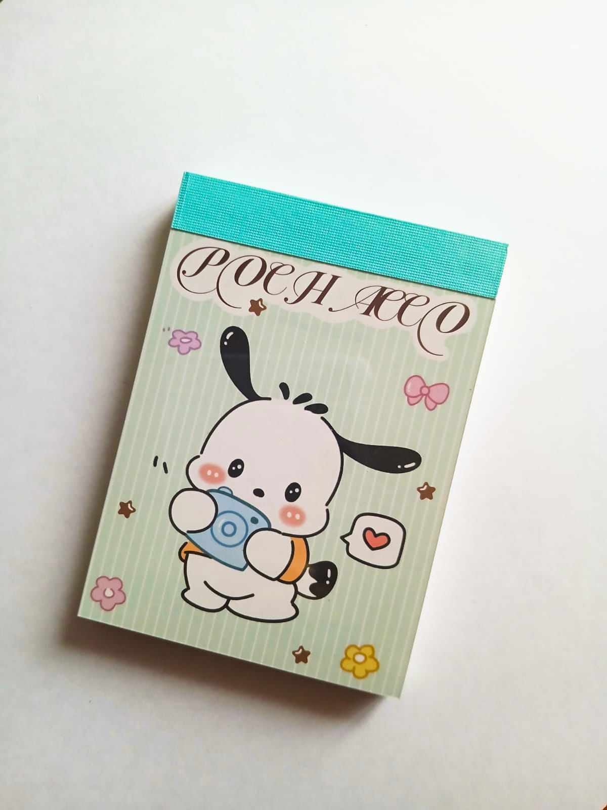 Mini anotador de tapa blanda con diseño de SANRIO y detalles de flores y corazones. Tiene hojas internas ideales para anotar recordatorios, listas o ideas rápidas y llevar en la mochila, cartera o escritorio.