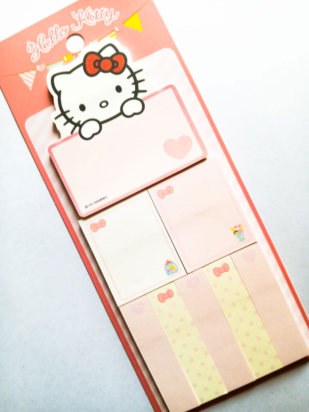 Set de notas adhesivas Hello Kitty en tonos rosa pastel. Incluye un post it grande con la carita de Hello Kitty, dos bloques cuadrados y tiras largas tipo pestañas para marcar páginas. Ideal para anotar recordatorios, decorar la agenda y organizar apuntes con mucha ternura.