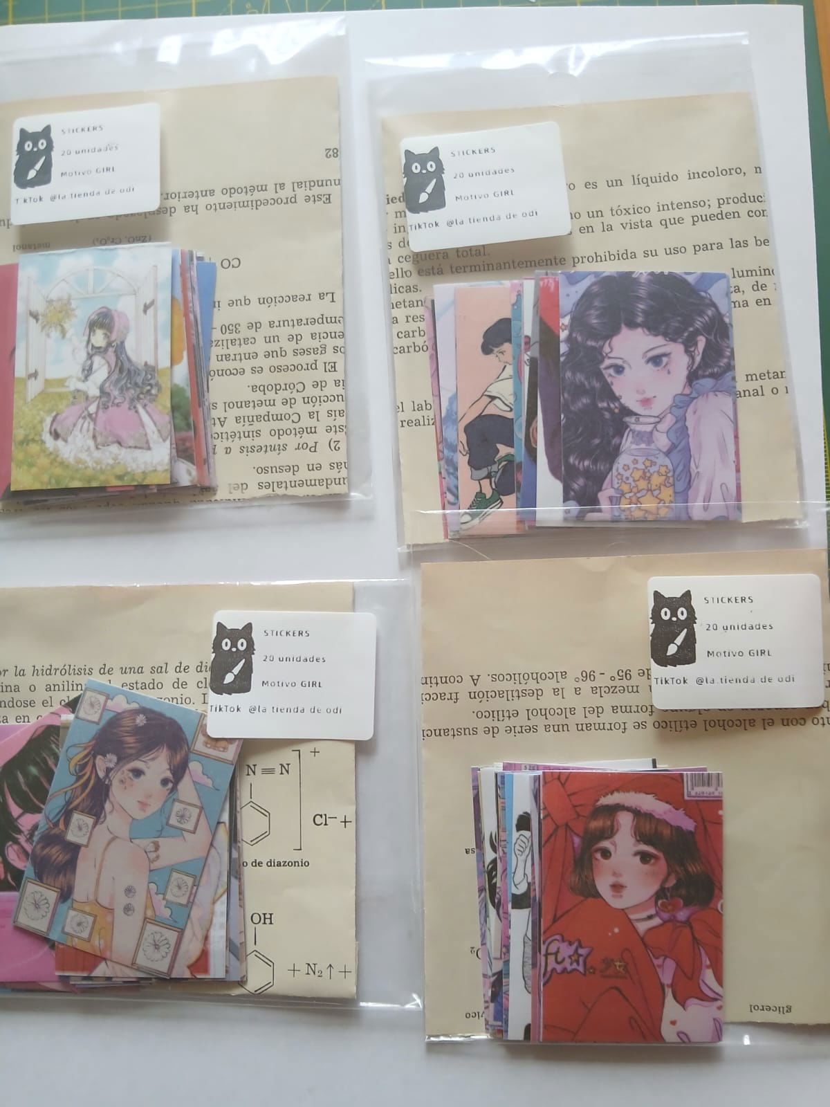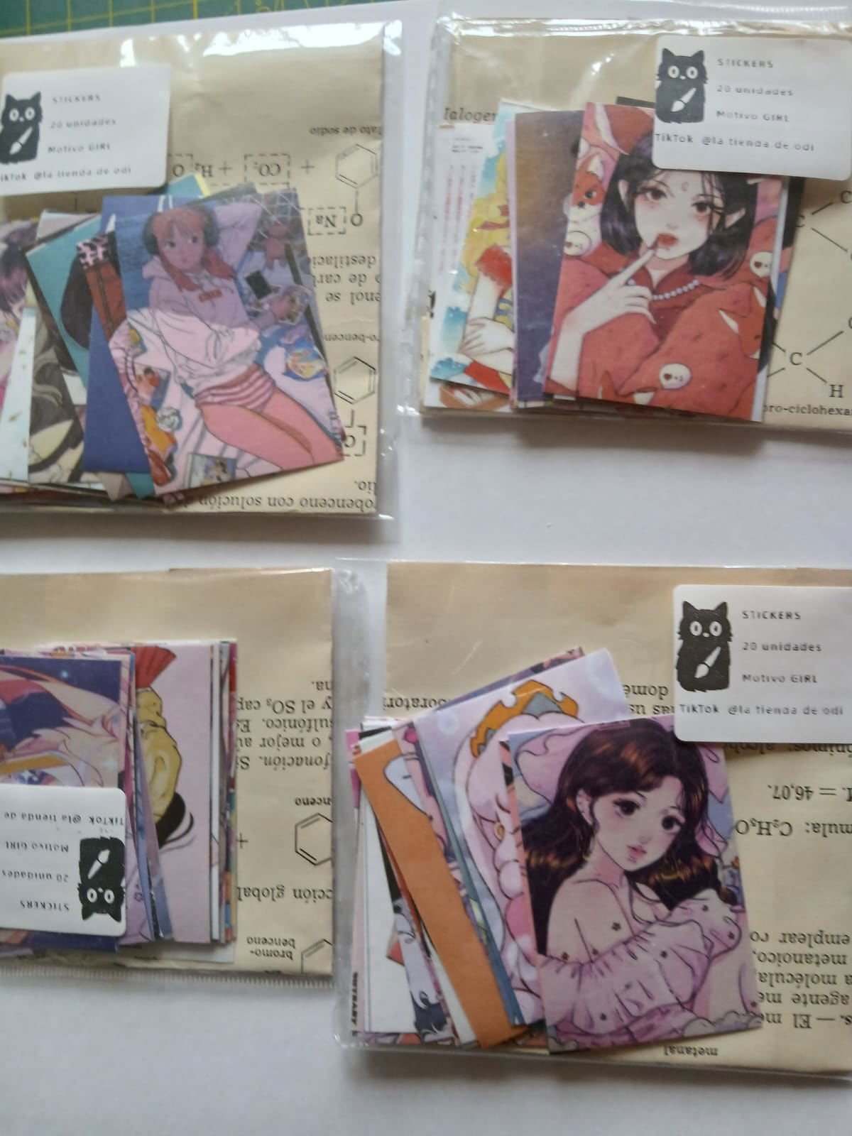 Pack de 20 stickers adhesivos con ilustraciones de chicas estilo anime/aesthetic, en formato mini tarjetita rectangular. Vienen en colores vibrantes y diferentes diseños, ideales para decorar journals, agendas, cuadernos, cartas y collages con mucha onda girl power.
