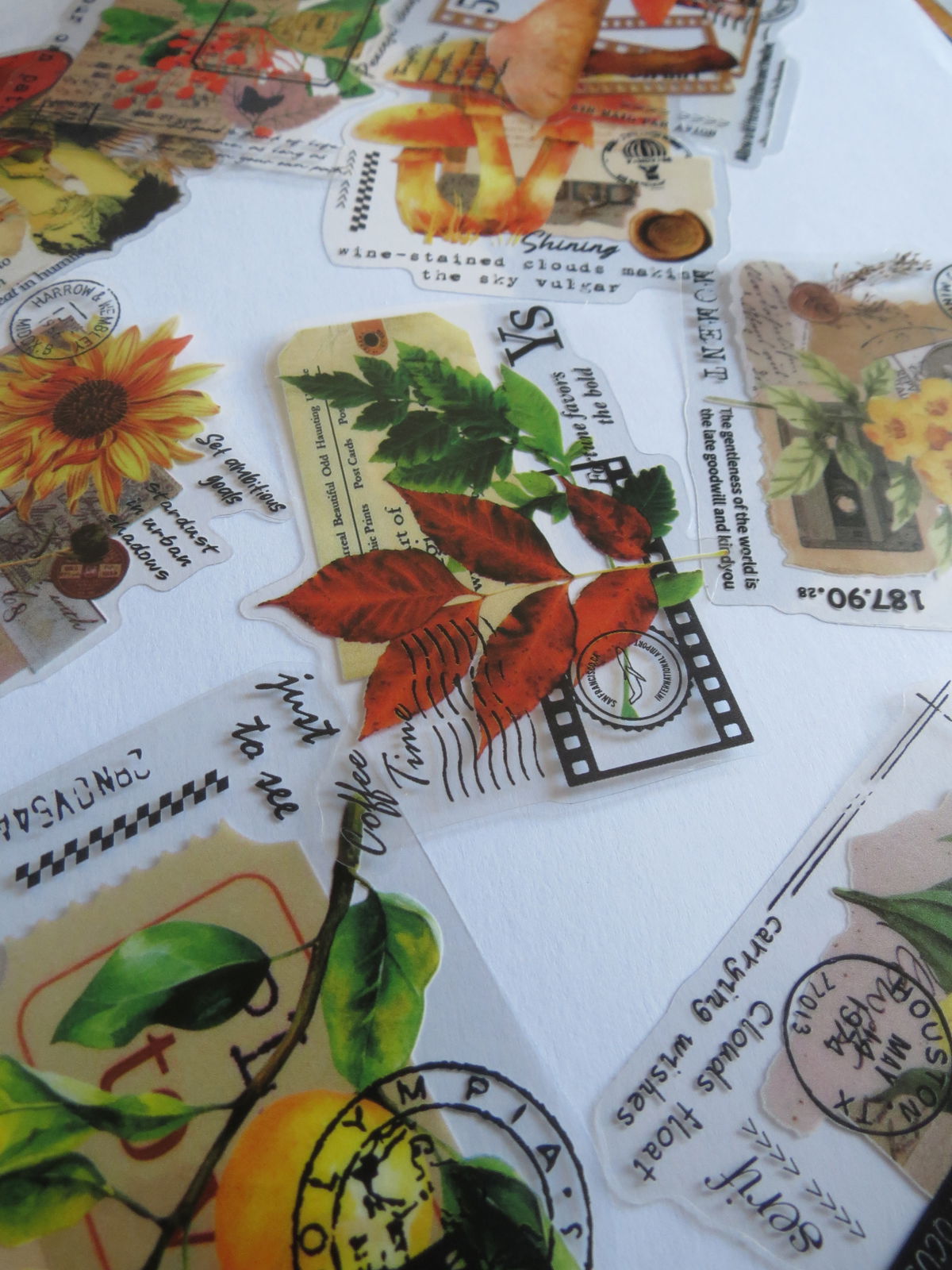Stickers adhesivos con ilustraciones de frutas, hojas otoñales, girasoles, hongos y elementos retro (sellos postales, cintas de película, frases en inglés). Vienen troquelados y con fondo transparente, ideales para decorar journals, cuadernos, cartas y scrapbooking con una estética vintage cálida.