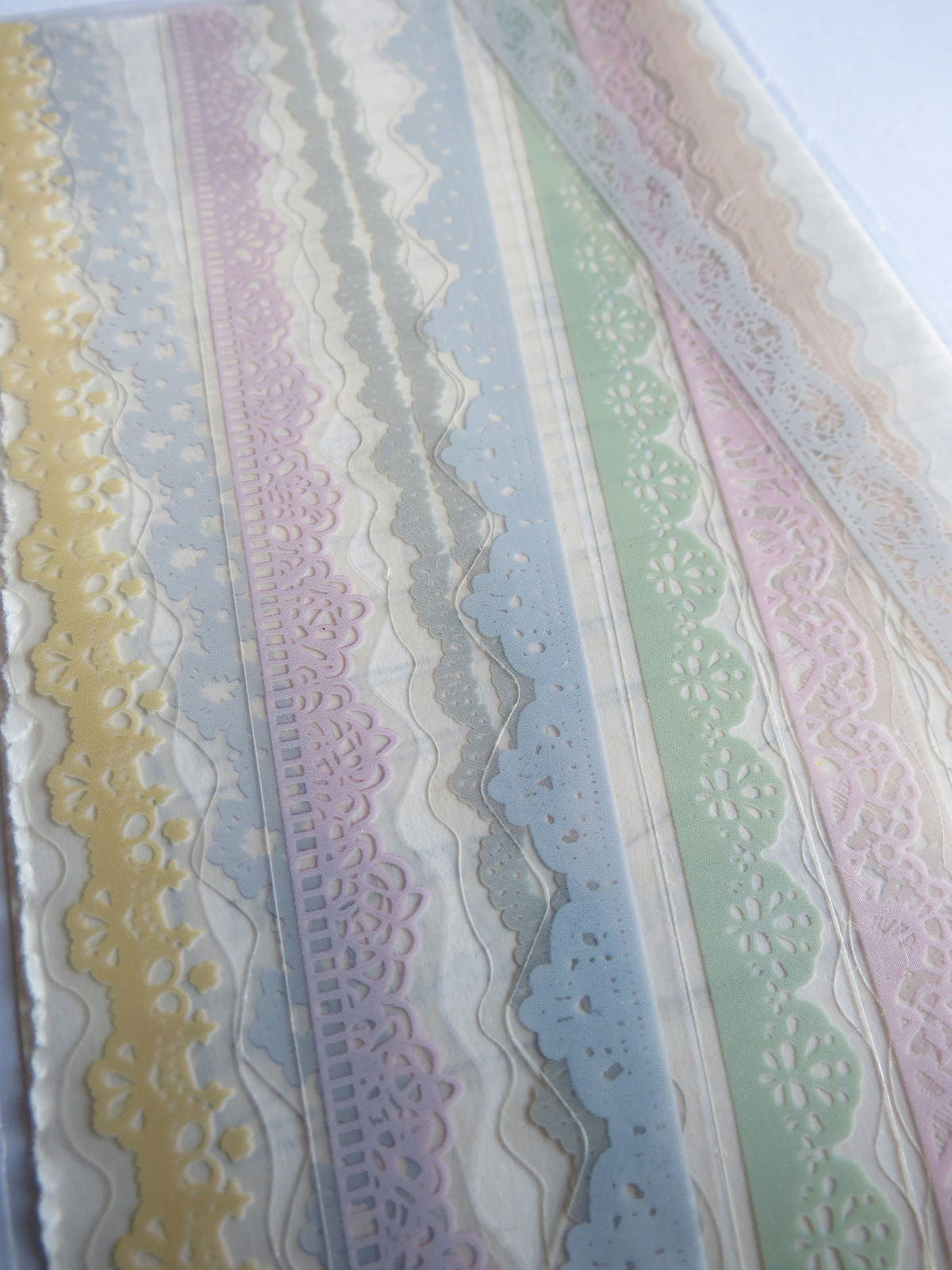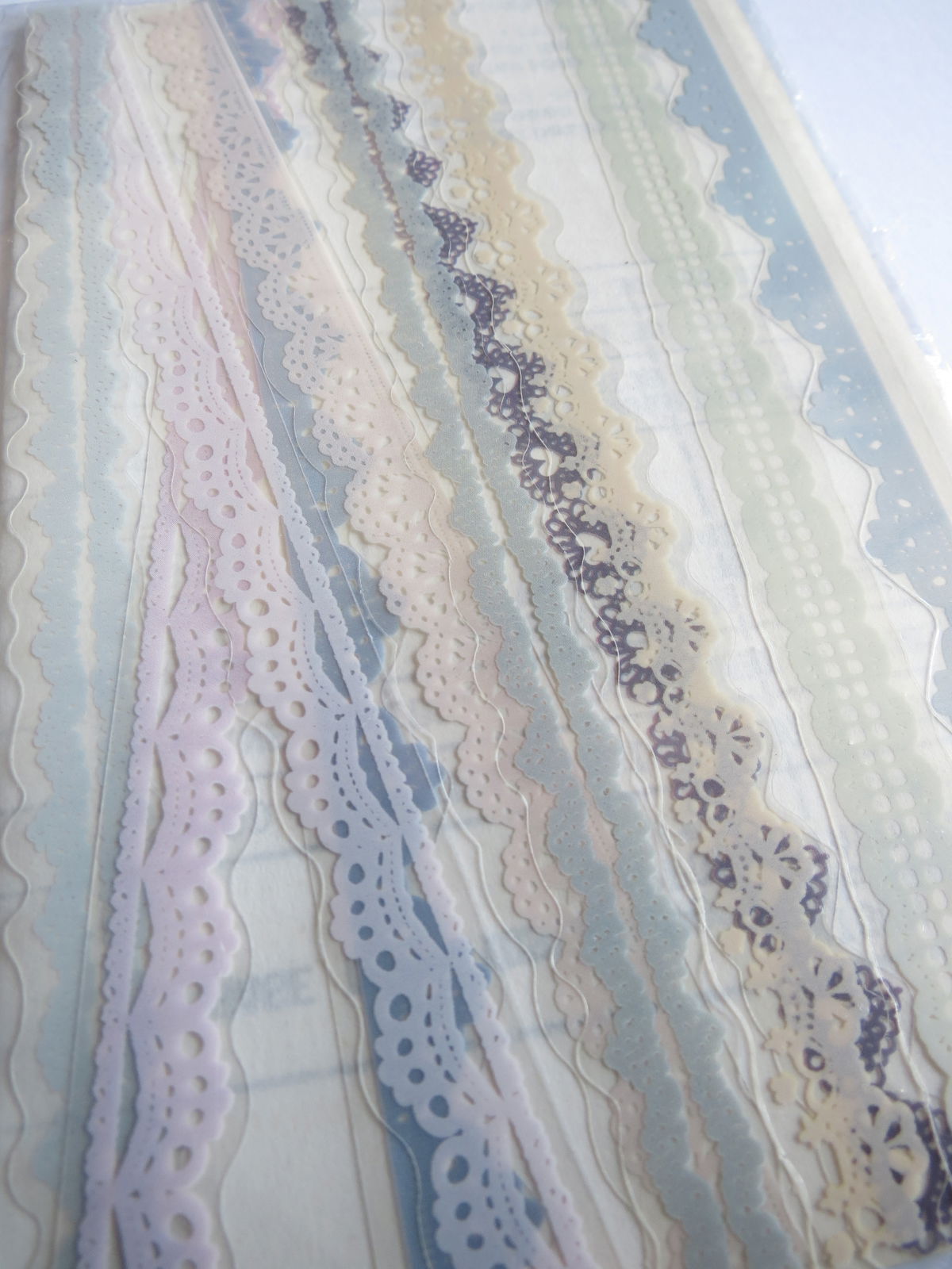 Stickers en forma de tiras largas con diseños tipo puntilla/encaje en tonos pastel (lila, celeste, verde, crema, rosa). Ideales para decorar bordes de páginas, fotos, tarjetas y journals con un toque delicado y romántico.