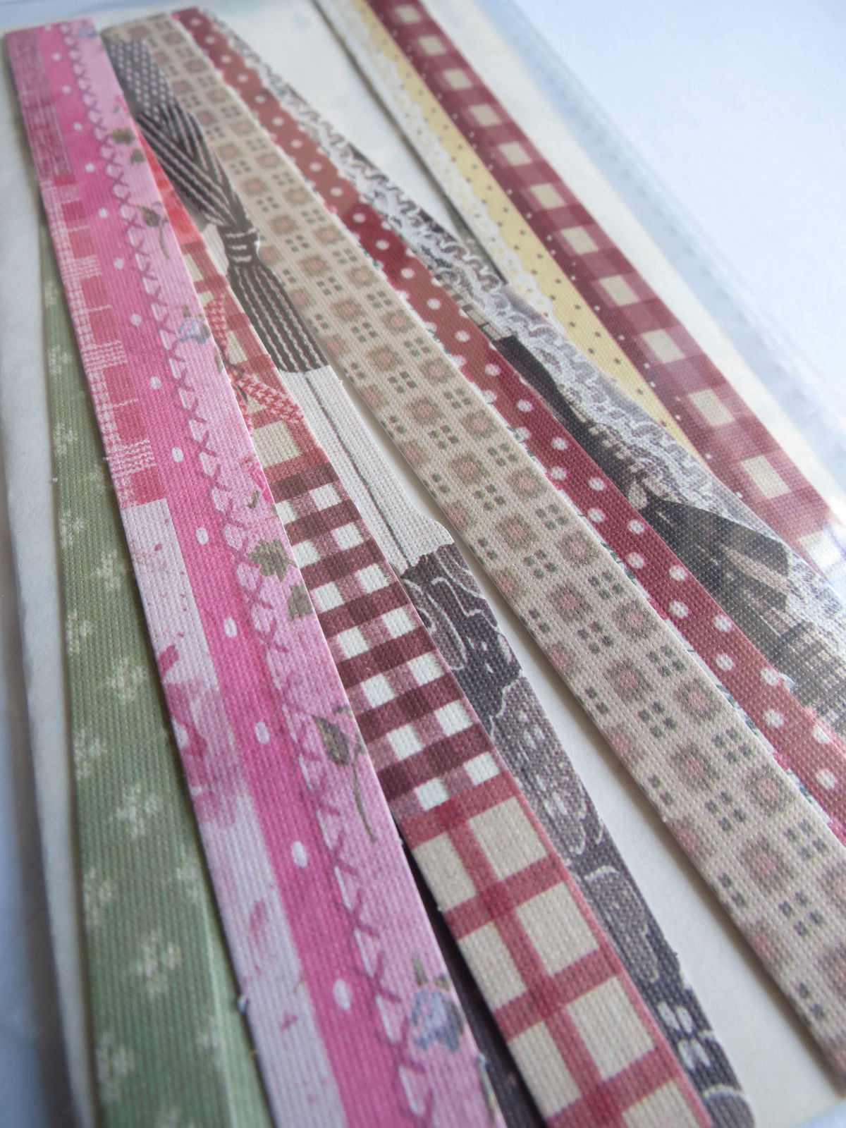 Stickers en tiras con estampas tipo patchwork y tela: cuadritos, lunares, flores y rayas en rosa, bordo, beige y verde. Perfectos para proyectos de scrapbooking, cartas y cuadernos con estética rústica y cozy.