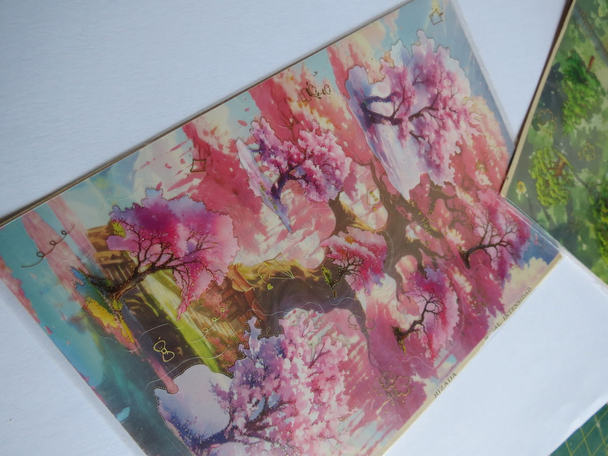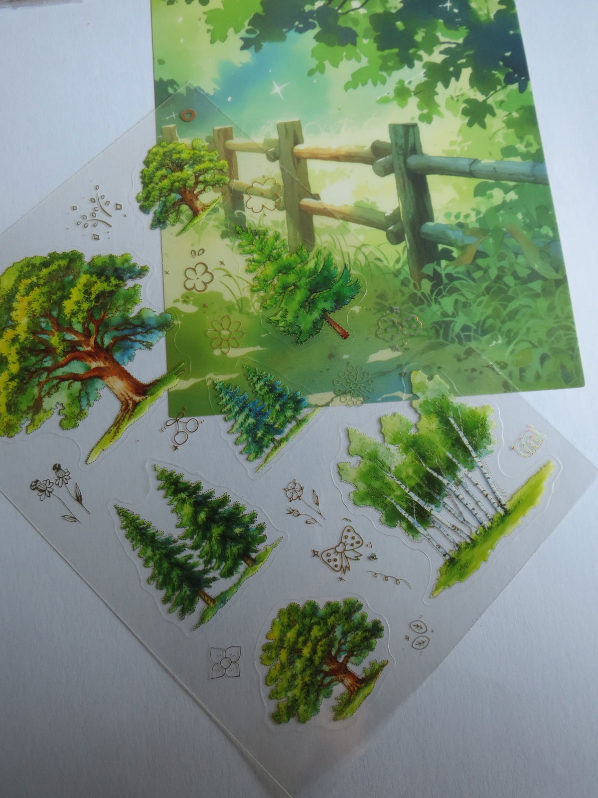 Una plancha de sticker adhesivo y una ilustraciones de árboles y paisajes de bosque, algunos en verde intenso y otros en tonos rosas tipo sakura. Tienen detalles brillantes/dorados y fondo casi transparente, ideales para decorar journals, cartas, cuadernos y scrapbooking con una estética de naturaleza mágica.