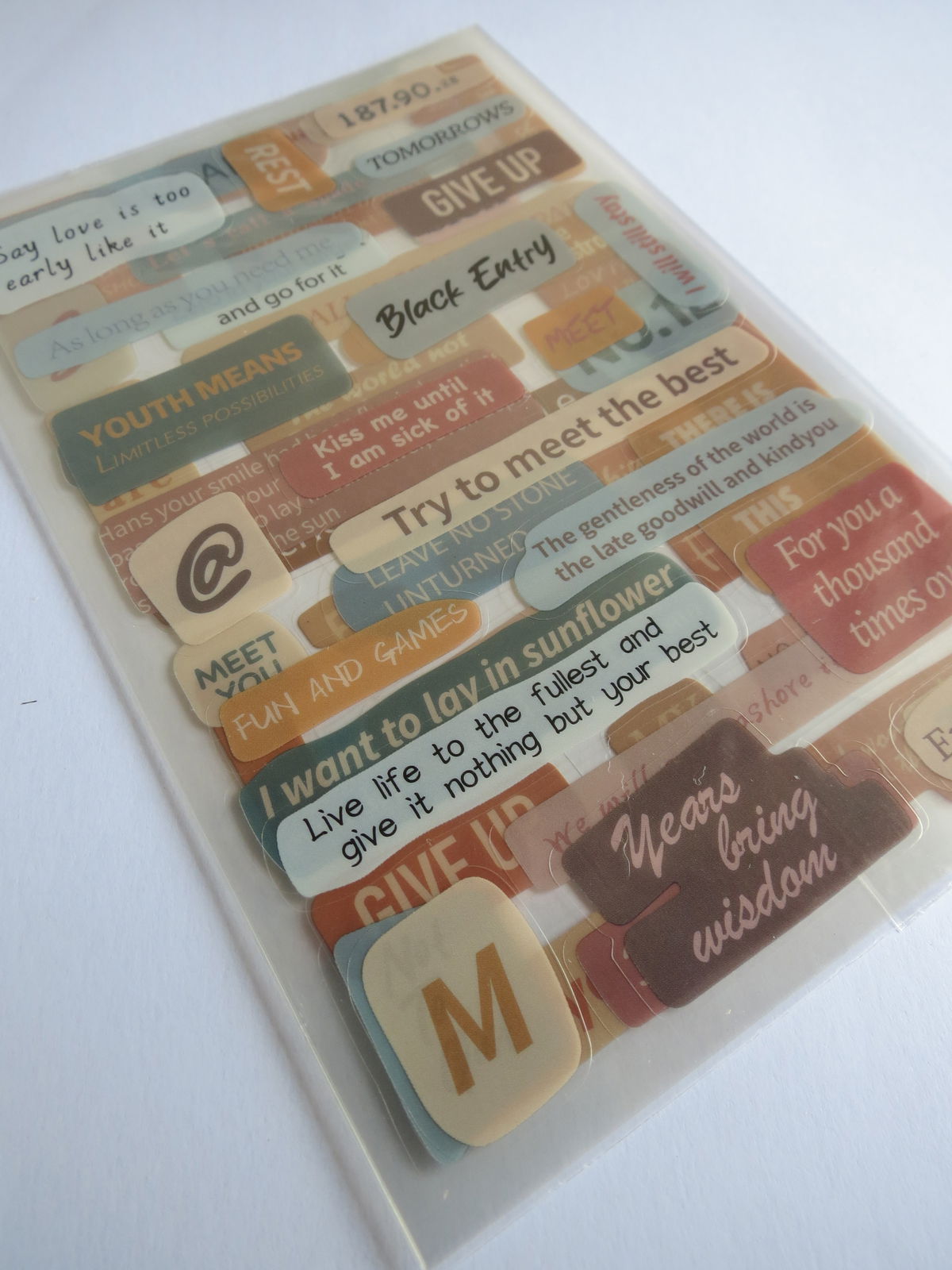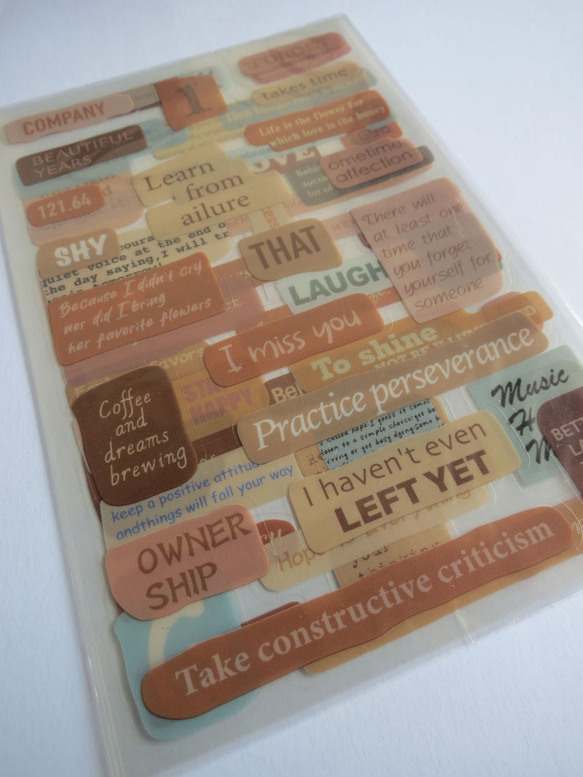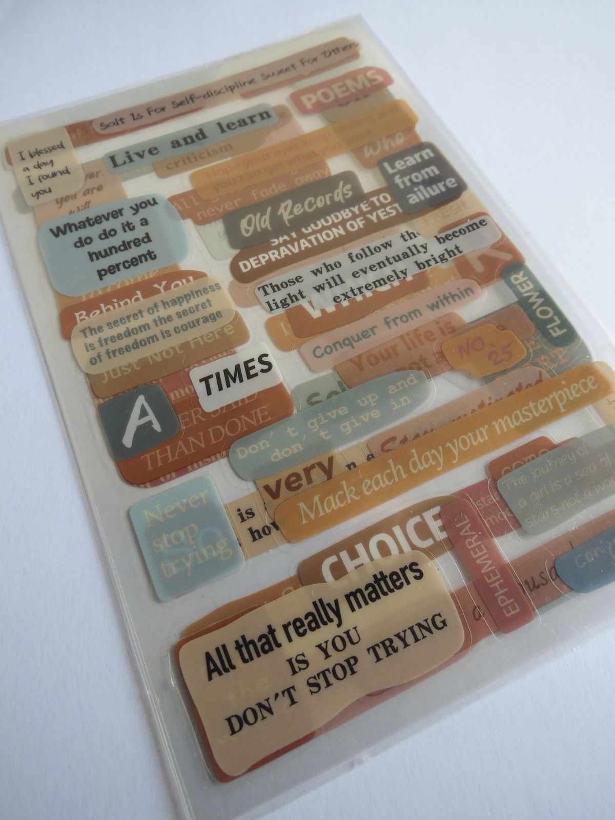 Pack de 3 plantillas de stickers adhesivos con frases en inglés de ánimo y reflexión (“Never stop trying”, “I miss you”, “Live and learn”, etc.) en tonos beige, marrón y celeste. Ideales para resaltar páginas de journal, planners, cartas y proyectos de scrapbooking con mensajes positivos.