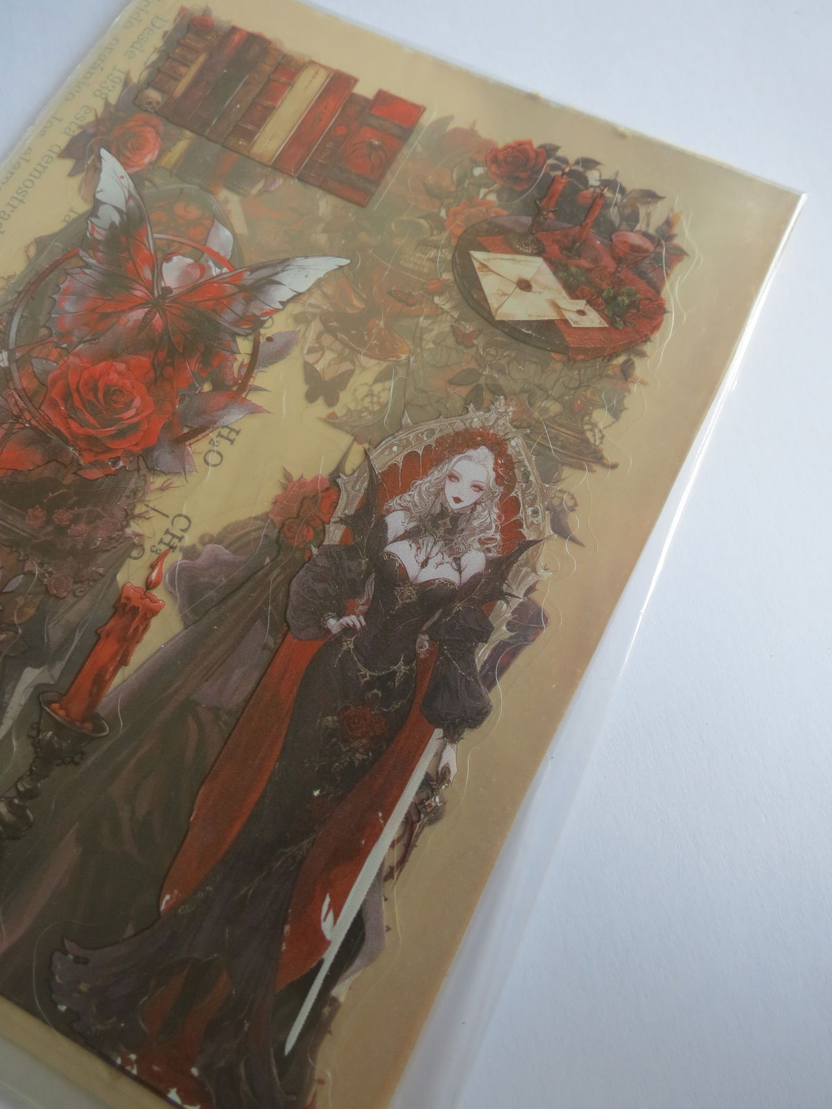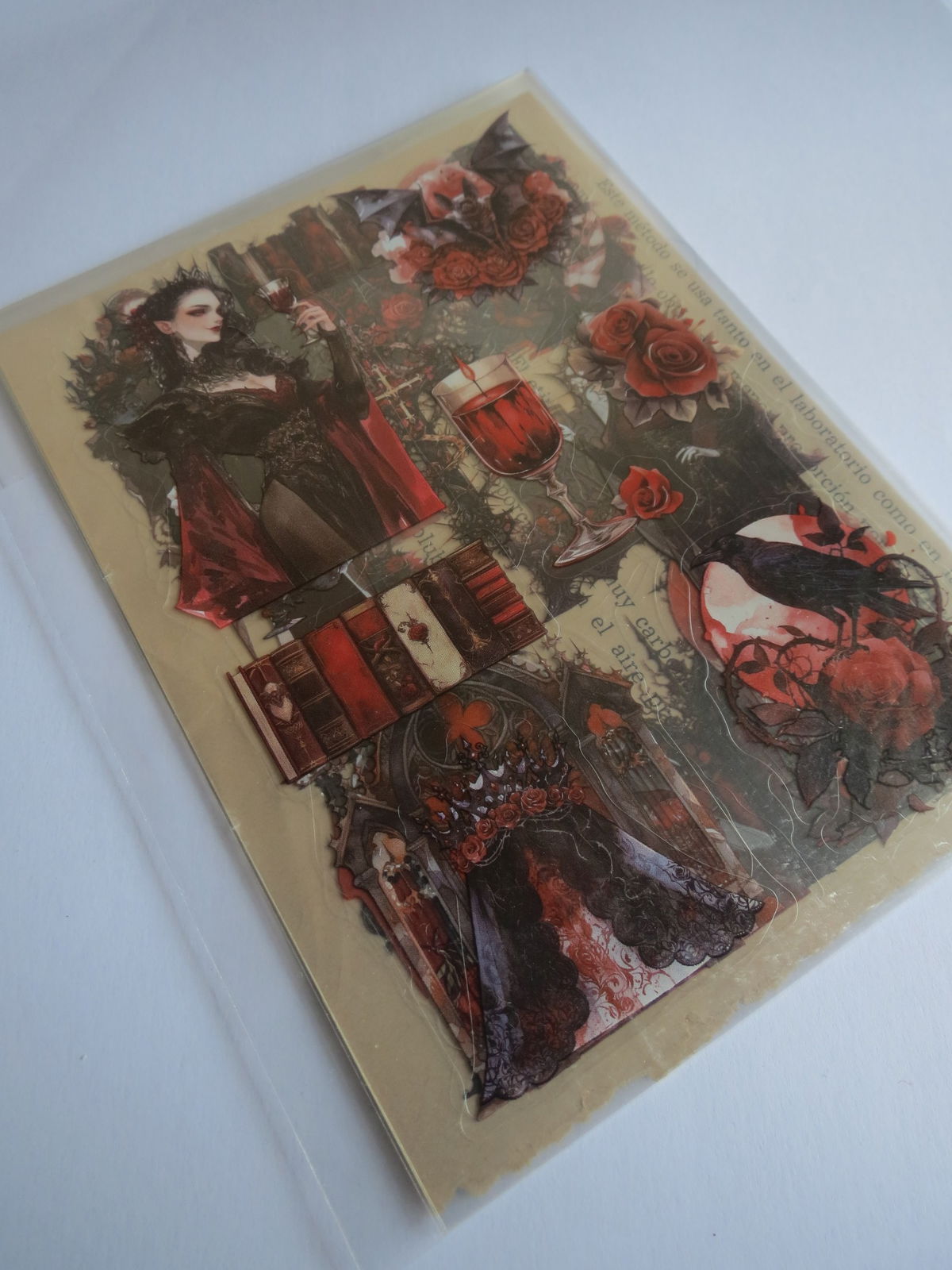 Pack de 5 unidades de Stickers adhesivos estilo gótico/vampiresa, con ilustraciones de chicas oscuras, rosas rojas, copas de vino y detalles victorianos. Ideales para journaling, collages y decoraciones con estética dark–romántica.