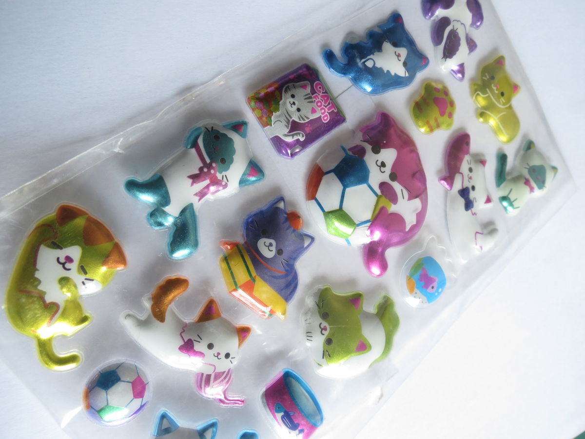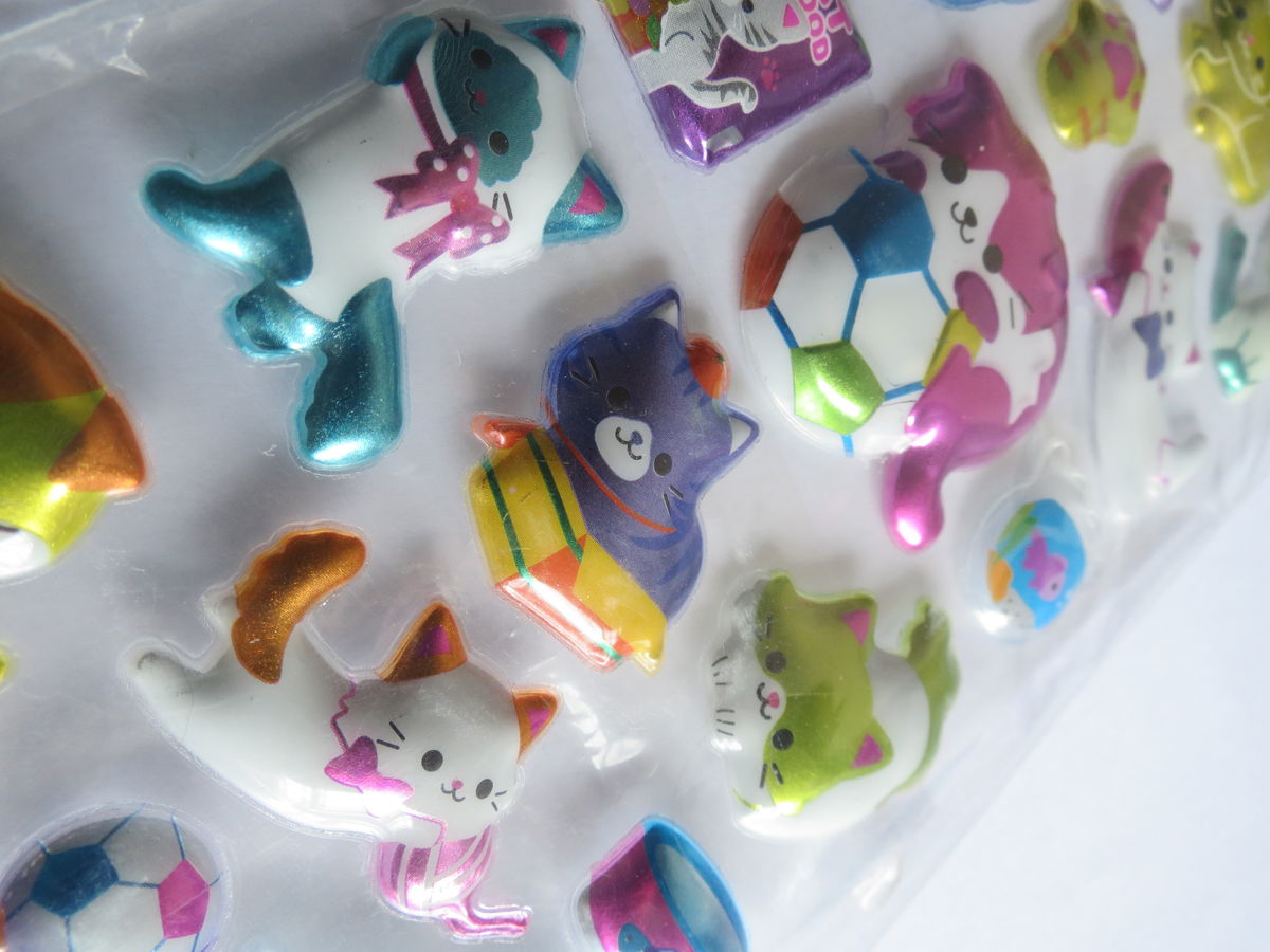 Una plantilla de stickers inflados de gatitos metalizados, súper coloridos y brillantes, con pelotas, peces y accesorios para darle un toque divertido a tus cuadernos y cartas.